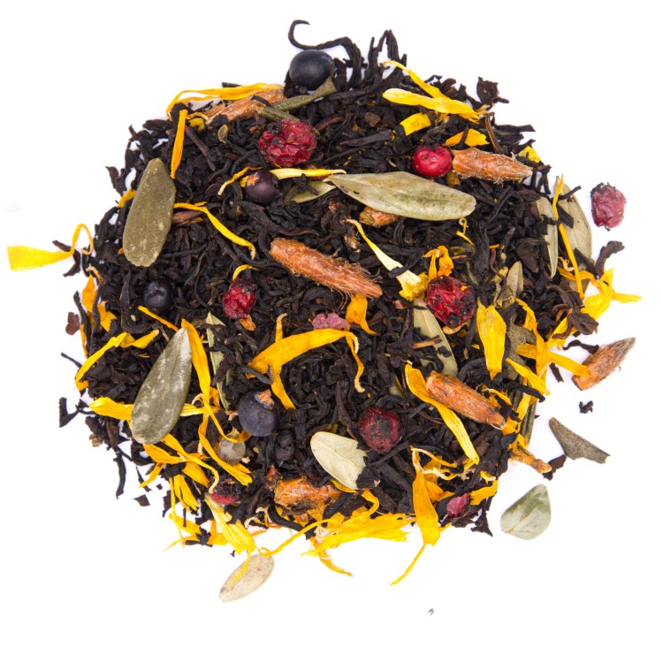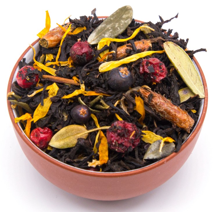 Чай черный индийский Ассам, почки сосны, плоды можжевельника, ягоды брусники, листья брусники, лепестки календулы, ароматизатор "Садовые травы"